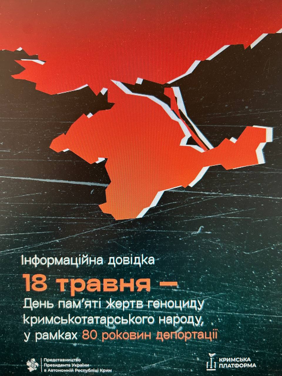 Депортація кримськотатарського народу — переважно дітей, жінок, літніх людей — радянським тоталітарним режимом була кульмінацією російської колоніальної політики, направленої на детатаризацію Криму. Під час бойових дій, поки чоловіки були на фронті, радянська влада підступно вигнала дітей, жінок та літніх людей з власних домівок та відправила їх у вигнання — шлях, який для багатьох став останнім.