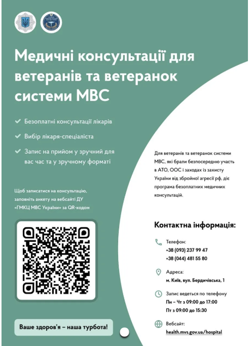 👉 На базі Державної установи «Головний медичний клінічний центр МВС України» (м. Київ, вул. Бердичівська, організовано безоплатні медичні консультації для звільнених зі служби ветеранів, що брали участь в АТО, ООС та у заходах із захисту України від збройної агресії рф.