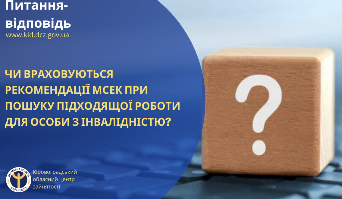 Нагадаємо, що питання підбору підходящої роботи врегульовані статтею 46 Закону України “Про зайнятість населення”, а підбір підходящої роботи для осіб з інвалідністю здійснюється з урахуванням положень Закону України “Про основи соціальної захищеності осіб з інвалідністю в Україні”. Статтею 18-1 цього Закону передбачено, що Державна служба зайнятості здійснює пошук підходящої роботи відповідно до рекомендацій МСЕК, наявних у особи з інвалідністю, кваліфікації та знань, з урахуванням її побажань.