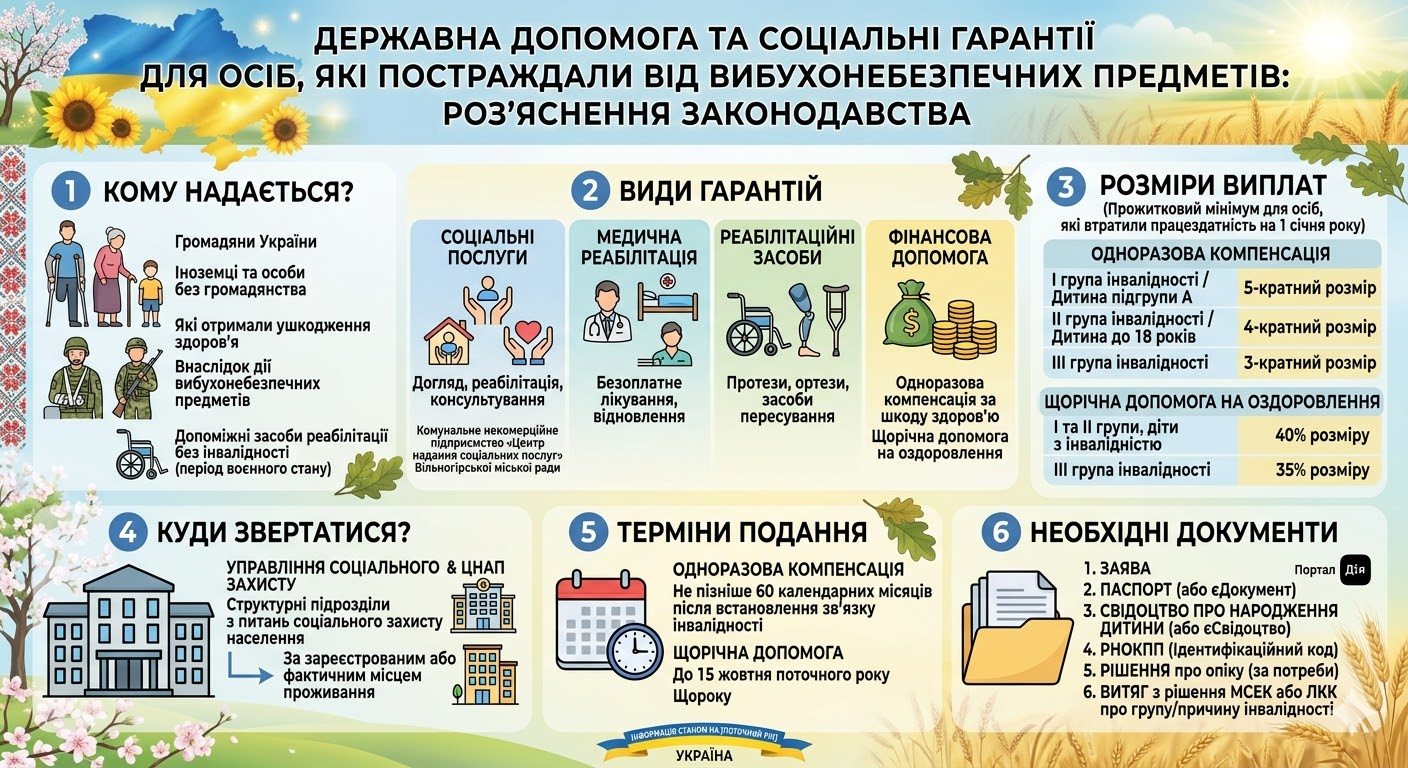 Особи, які отримали інвалідність через вибухонебезпечні предмети (ВНП), мають право на кілька видів державної підтримки, що регулюються Законом України «Про протимінну діяльність в Україні».