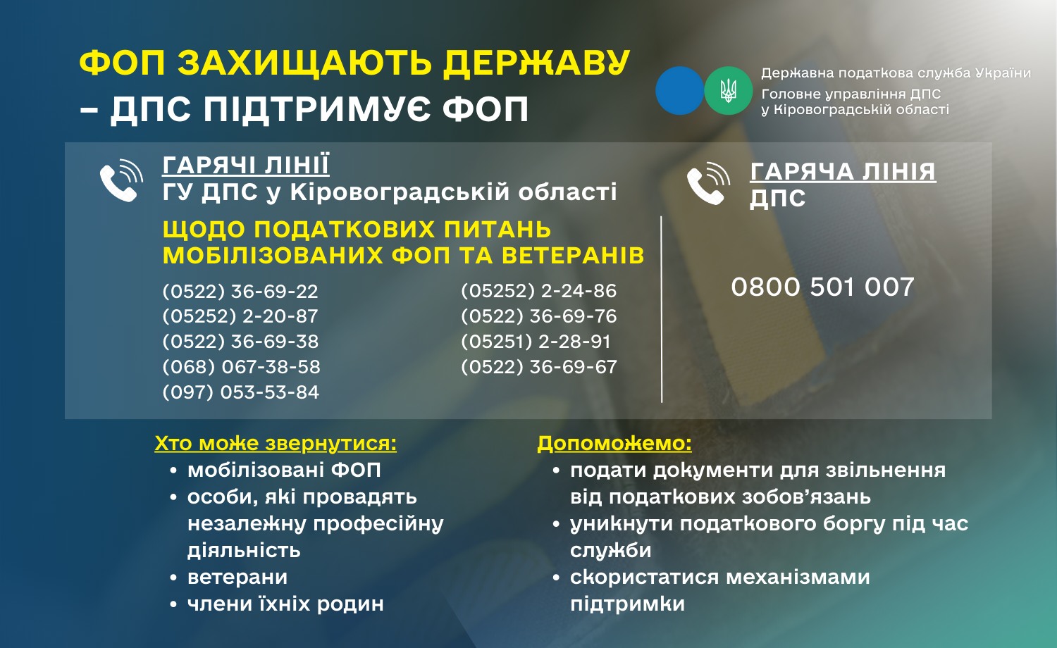 Нагадаємо, що створення «гарячих ліній» є складовою комплексу заходів для врегулювання податкових питань мобілізованих ФОП та ветеранів.