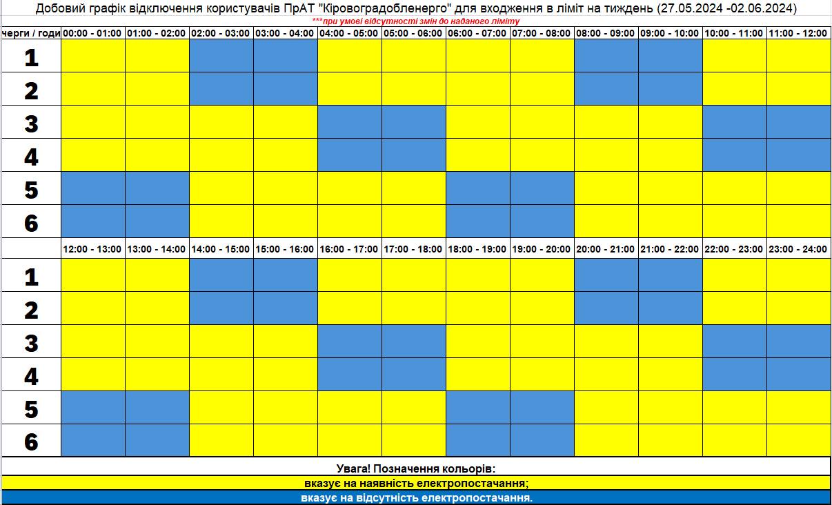 По Кіровоградській області в період з 27.05.2024 по 02.06.2024 буде діяти наступний графік: