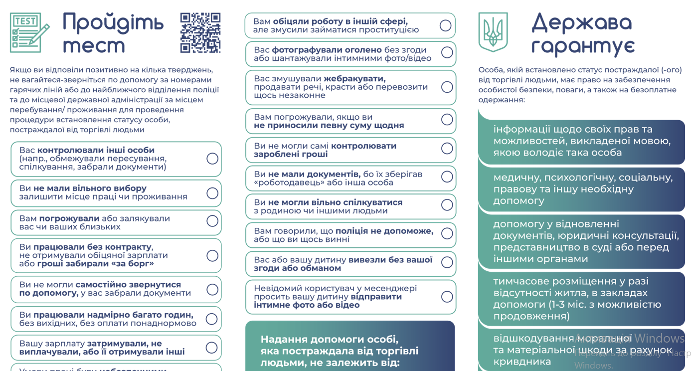У рамках інформаційної кампанії, присвяченої Всесвітньому дню протидії торгівлі людьми, Національна соціальна сервісна служба України у співпраці з експертками Юлією Саченко та Наталією Куліковою, Міграційною поліцією України, МБО «Child Rescue», Міжнародною організацією з міграції (МОМ), ГС «Коаліція НУО з протидії торгівлі людьми», а також Міністерством соціальної політики, сімʼї та єдності України як національним координатором у сфері протидії торгівлі людьми, за фінансової підтримки уряду Швеції, розробили інформаційно-роз’яснювальну пам’ ятку для громадян.