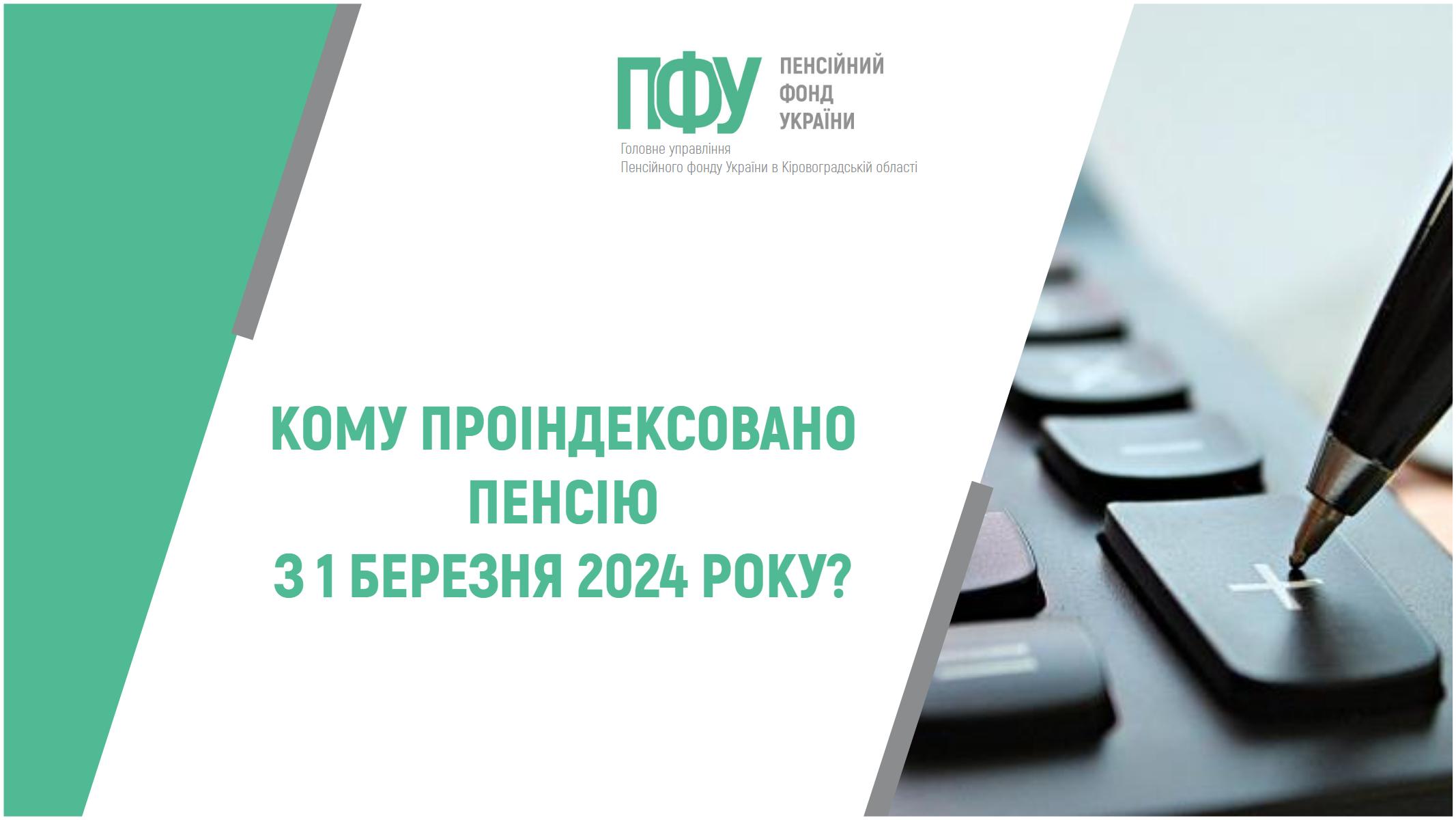 Відповідно до частини 2 статті 42 Закону України “Про загальнообов’язкове державне пенсійне страхування” з 01 березня 2024 року проведена індексація пенсій. Індексація проведена із застосуванням коефіцієнта збільшення показника середньої заробітної плати (доходу) в Україні, з якої сплачено страхові внески, та який враховується для обчислення пенсії, в розмірі 1,0796.