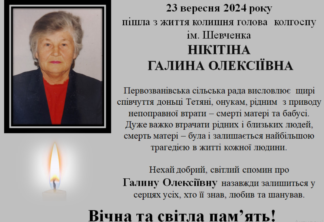 Первозванівська сільська рада висловлює щирі співчуття доньці Тетяні, онукам, рідним з приводу непоправимої втрати – смерті матері та бабусі. Дуже важко втрачати рідних та близьких людей, смерть матері – була і залишається найбільшою трагедією в житті кожної людини.