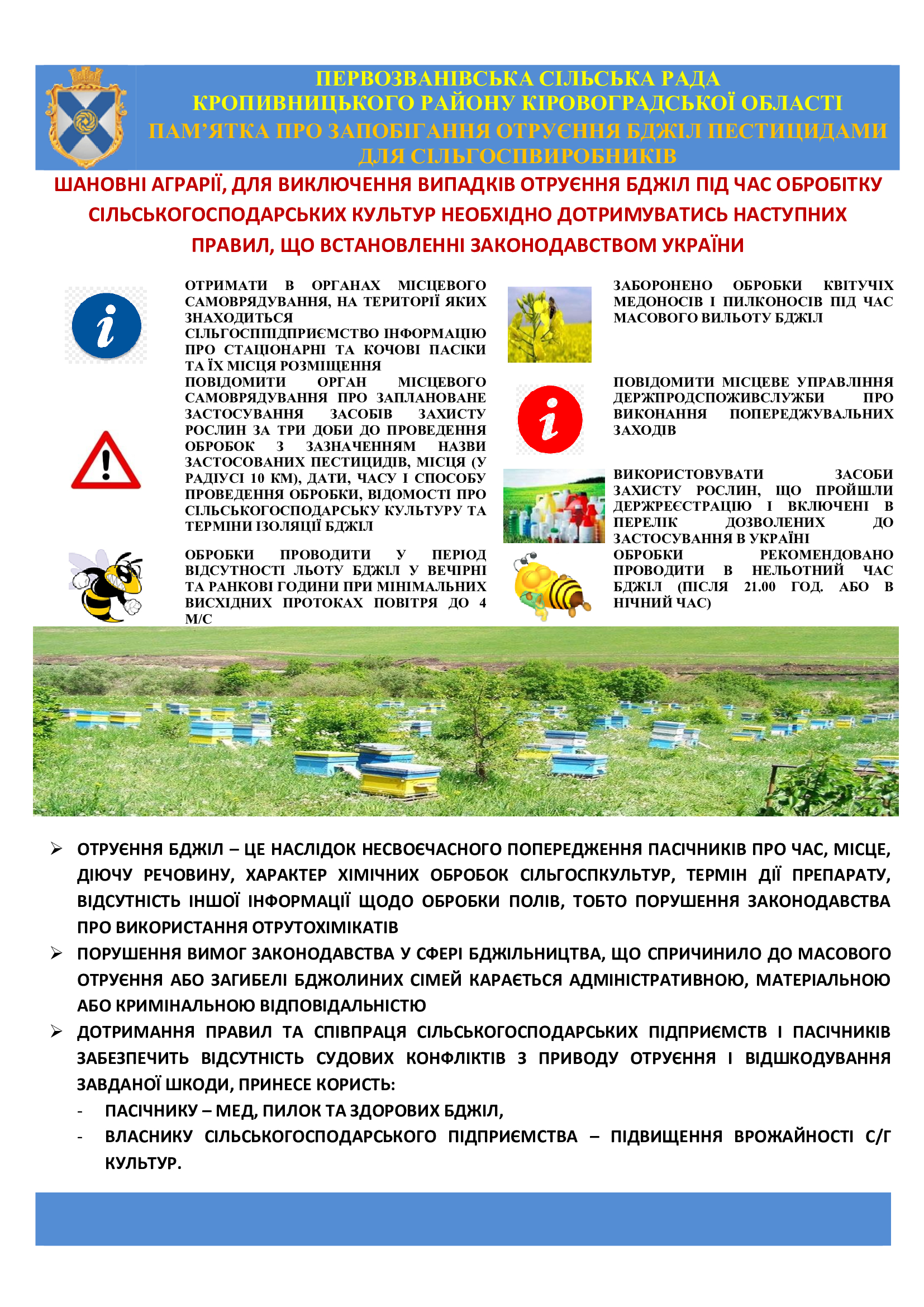 Головна ПАМ’ЯТКА ПРО ЗАПОБІГАННЯ ОТРУЄННЯ БДЖІЛ ПЕСТИЦИДАМИ ДЛЯ СІЛЬГОСПВИРОБНИКІВ