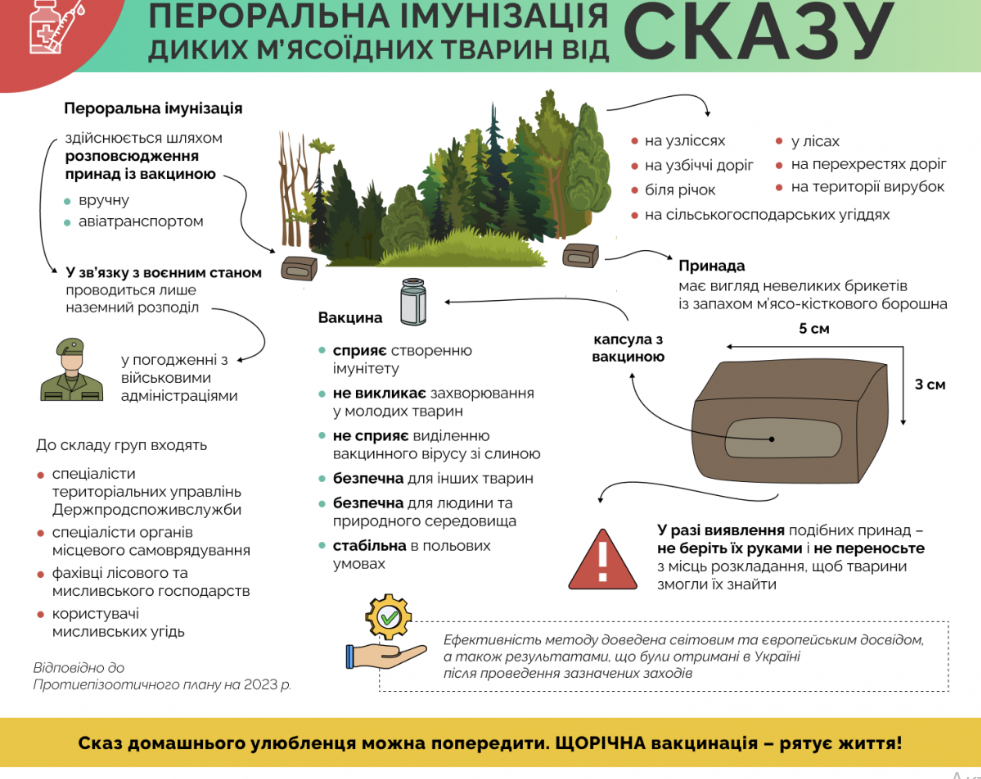 Кропивницьке районне управління Головного управління Держпродспоживслужби в Кіровоградській області (далі – Кропивницьке районне управління) повідомляє про те, що згідно з наказом Державної служби України з питань безпечності харчових продуктів та захисту споживачів від 15 серпня 2024 року № 583 «Про організацію заходів з проведення осінньої кампанії пероральної імунізації диких м’ясоїдних тварин у 2024 році», з метою виконання плану протиепізоотичних заходів з профілактики основних інфекційних і паразитарних хвороб тварин на 2024 рік, у другій половині вереснята на початку жовтня 2024 року на території Кропивницького району планується проведення кампанії з пероральної імунізації диких м’ясоїдних тварин проти сказу (далі – кампанія) з урахуванням Закону України «Про затве