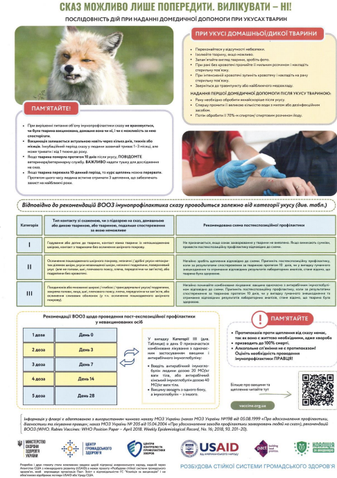 • Обов’язковозвернутись до травматологічного пункту найближчого закладу охорони здоров’я, в районах – районні лікарні, де проводитимуть профілактичні щепленняпроти сказу. Схему вакцинації визначає лікар – рабіолог або хірург чи травматолог. У разі, коли щеплення призначені, їх треба отримувати відповідно до схеми, визначеної лікарем, не відмовлятись від щеплень та не допускати самовільного порушення встановлених термінів.
