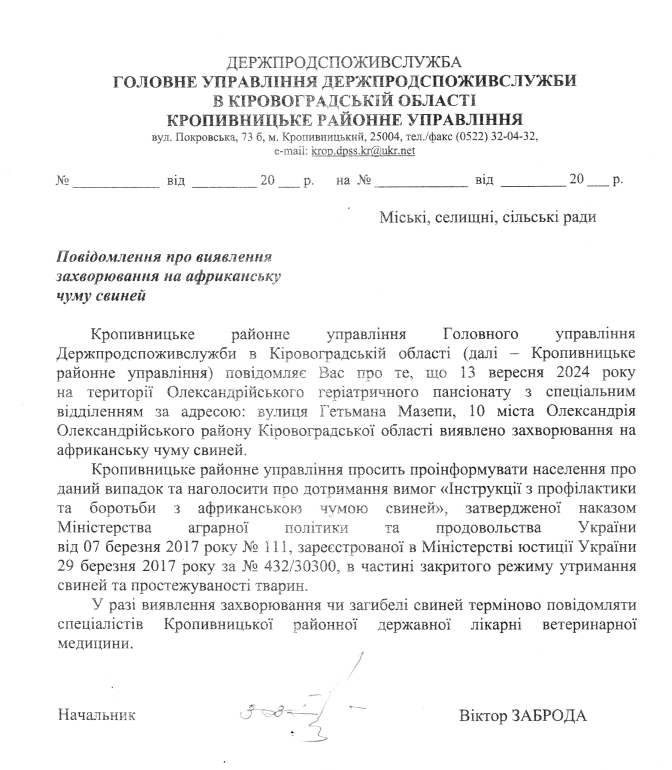 У разі підозри захворювання тварин на АЧС терміново звертайтеся до державних установ ветеринарної медицини та повідомляйте Головне управління Держпродспоживслужби в Кіровоградській області за телефоном: (0522) 32 13 61.