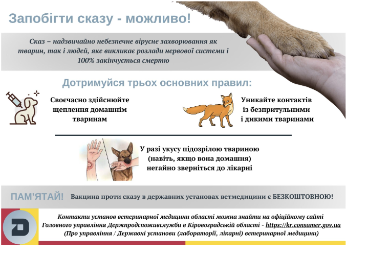 Кропивницьке районне управління Головного управління Держпродспоживслужби в Кіровоградській області вкотре наголошує, що основним захистом населення та домашніх тварин від сказу є обов’язкове їх щорічне щеплення. Вакцинація є обов’язковою умовою під час будь-якого переміщення тварини на території чи за межі України, допуску до полювання, участі у заходах.