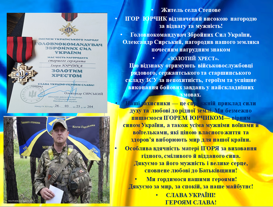 Житель с. Степове ІГОР ЮРЧИК Первозванівської громади нагороджений високою відзнакою за мужність та відвагу! 14.07.2025